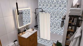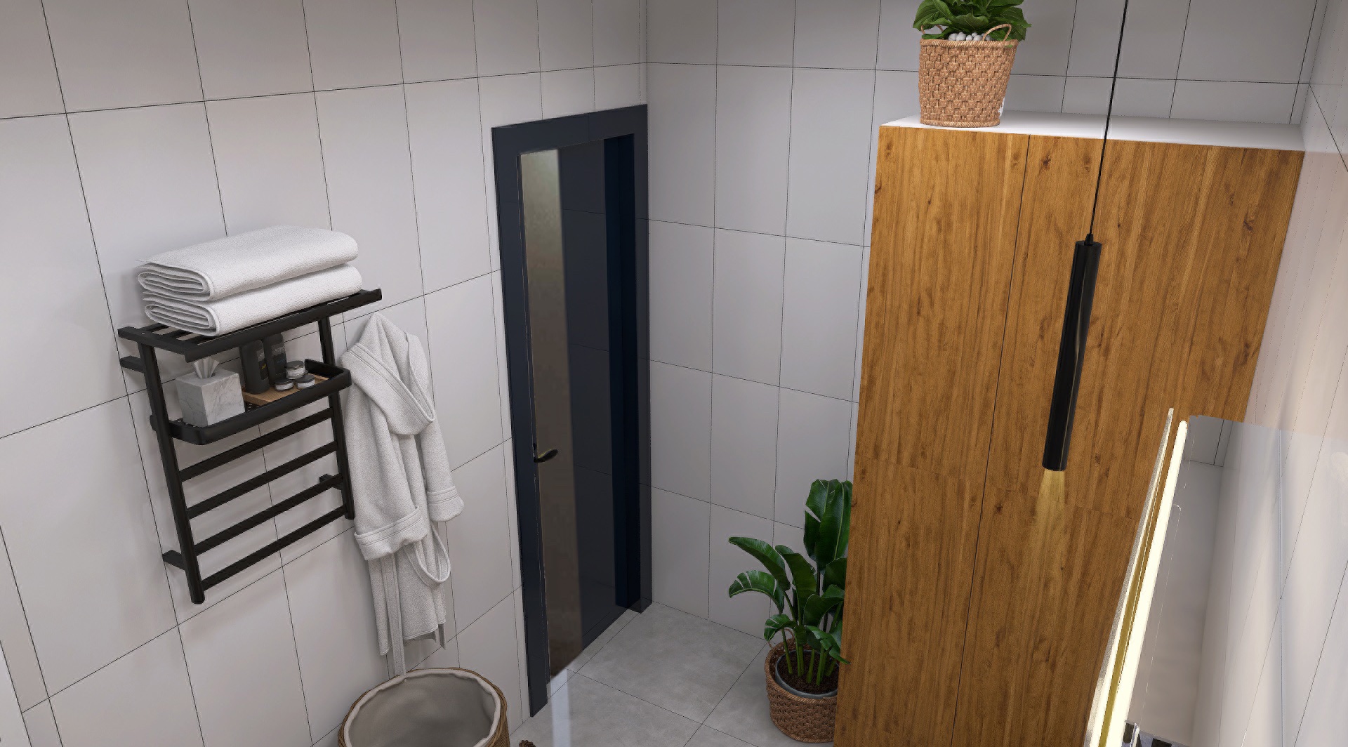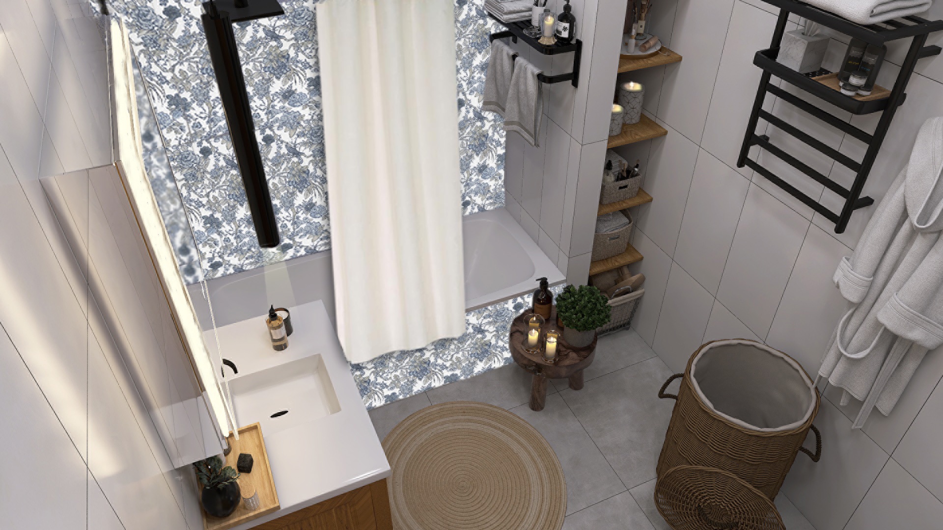 В качестве дополнения были добавлены плетеные корзины, ковер светлого оттенка, растения, деревянный табурет и аксессуары для ванной.