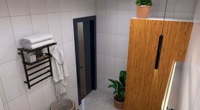 На финише ванная преобразилась и стала уютнее, "визуальный шум" пропал и появилось ощущение присутствия природы, что и задумывалось в самом начале. Заказчик доволен преображением ванной.