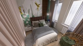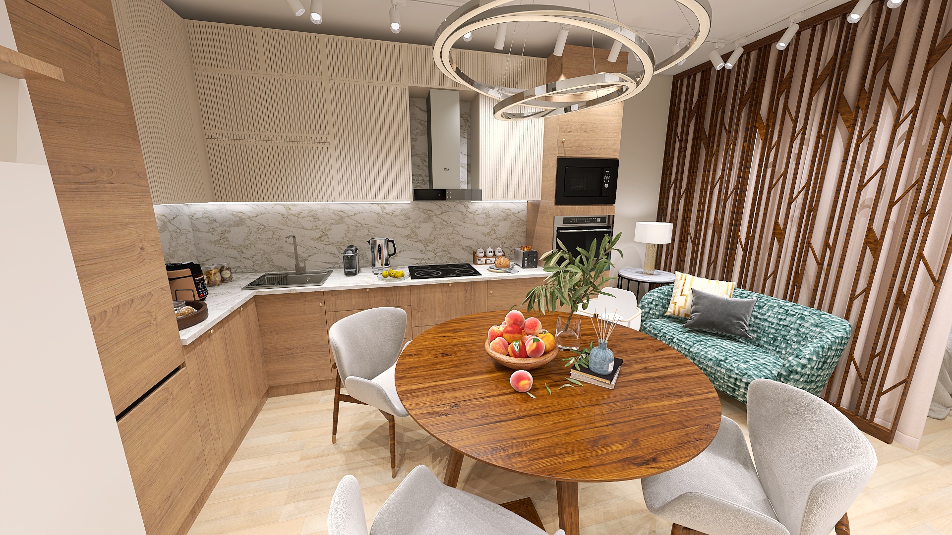 19 марта, 2025В квартире гостиная совмещена с кухней, спальня отделена перегородкой со шторой от общего пространства кухни-гостиной.