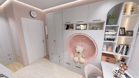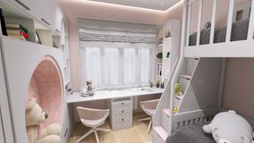 В детской расположена двухъярусная кровать + зона для игр +рабочие места + большие места хранения.
