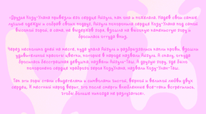«Друзья Козу-Улана привезли его сердце Айгуль, как она и пожелала. Надев свои самые лучшие одежды и собрав своих подруг, Айгуль похоронила сердце Козу-Улана под самой высокой горой, а сама, не выдержав горя, взошла на высокую каменистую гору и бросилась оттуда вниз.