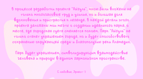В процессе разработки проекта "Айгуль", мною были вложены не только многочасовые труд и усилия, но и большая доля вдохновения и пристрастия к красоте природы. В каждой детали этого проекта заложены мои мечты о создании уголка гармонии и спокойствия, о месте, где городской суеты сменяются покоем природы. Парк "Айгуль" не только станет украшением города, но и будет способствовать сохранению окружающей среды и благополучию реки Аламедин.