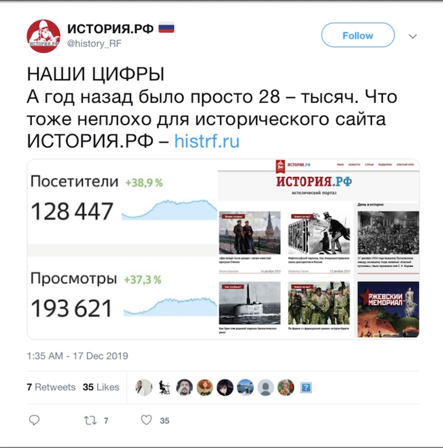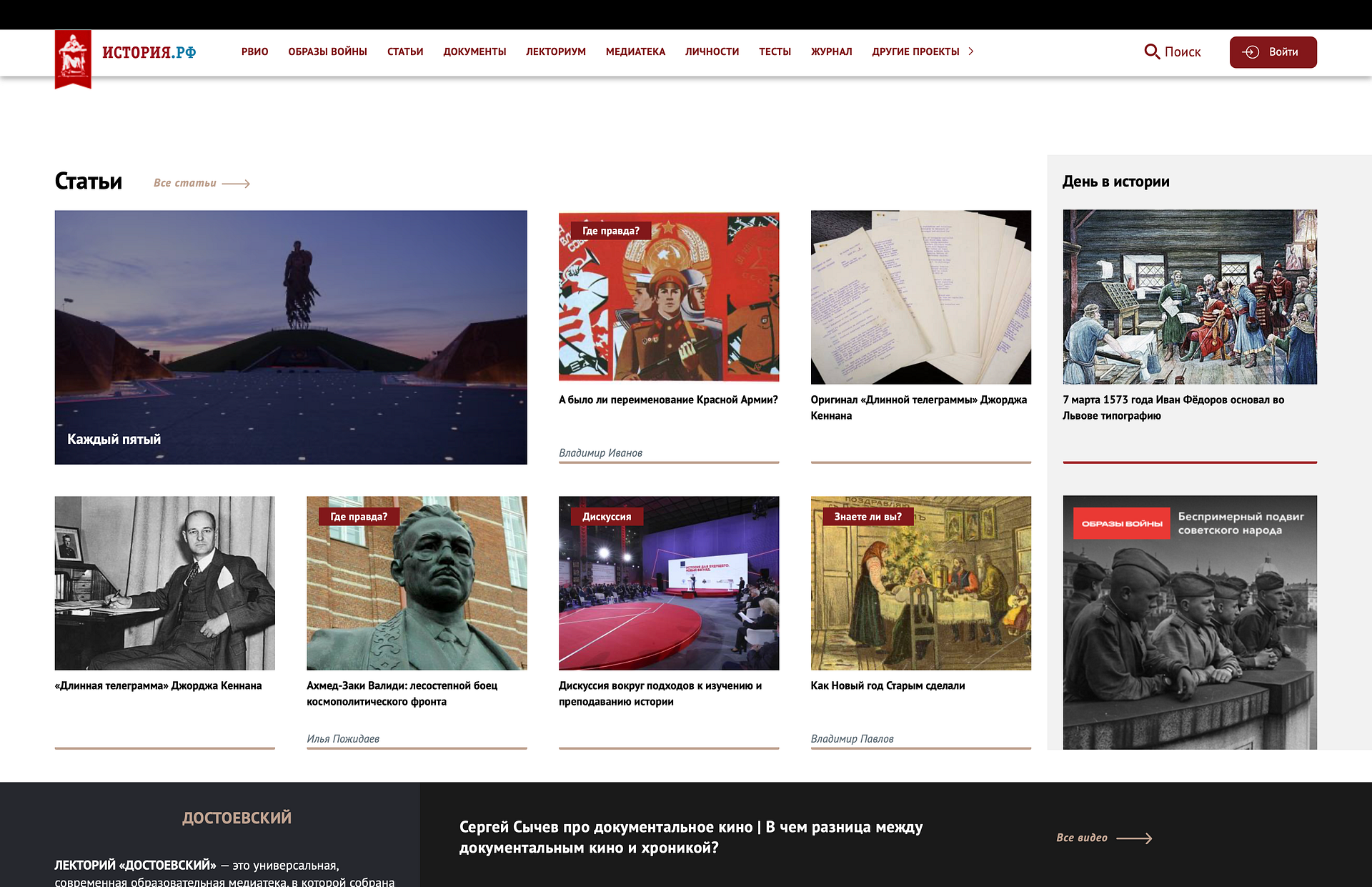 Запустил и курировал популярные рубрики — "Знаете ли вы", "Краткий курс истории", "Что если бы...", "Живая история", а также интерактивные тесты и лекции, ориентированные на массовую аудиторию. Совместно с Министерством обороны Российской Федерации запущен уникальный раздел, для публикации документов времен Великой Отечественной войны.