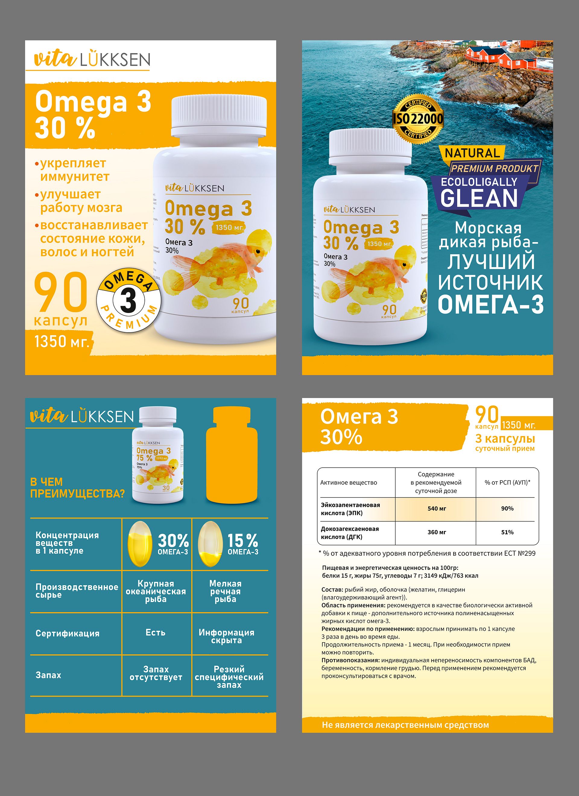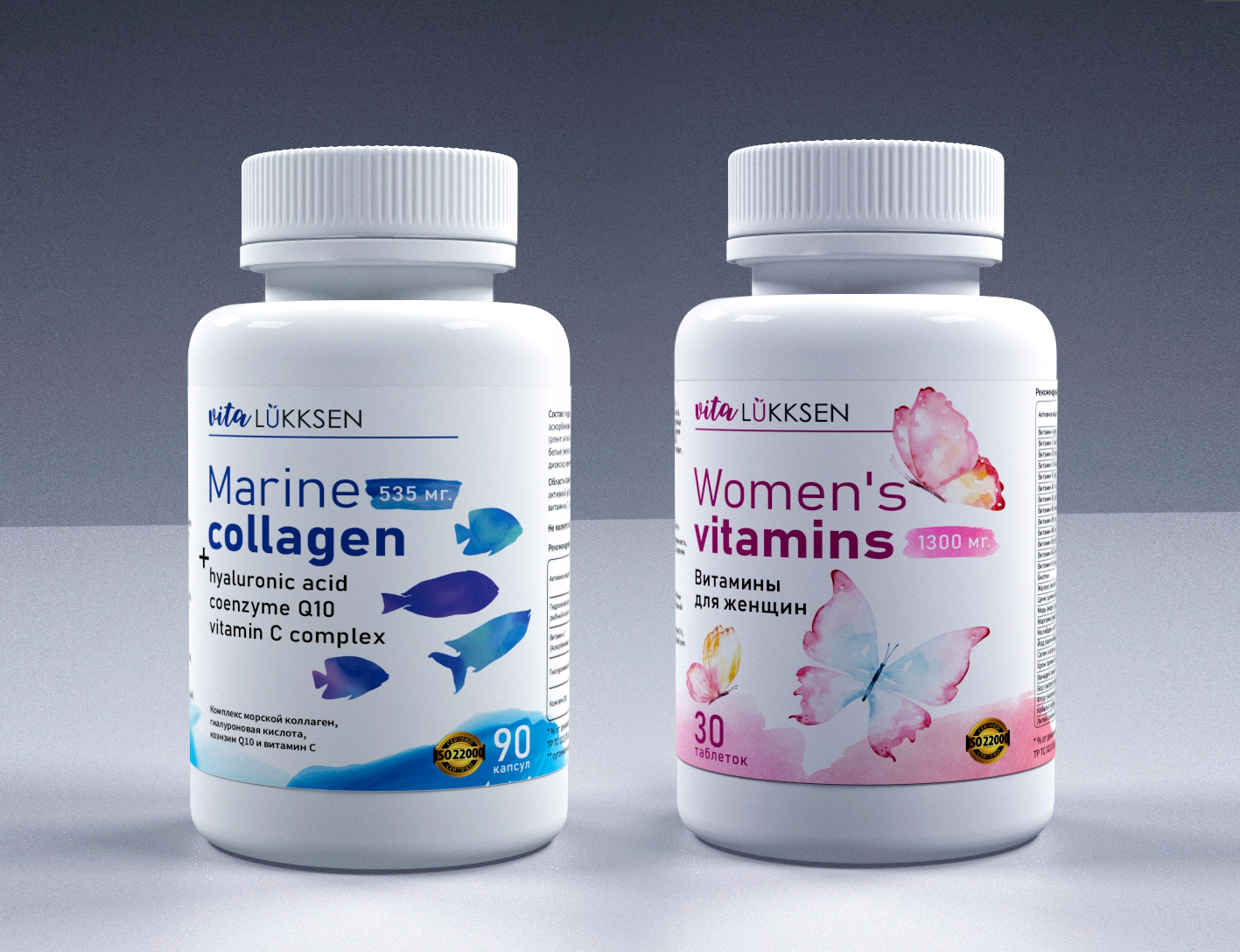 Были разработаны этикетки для витаминов и БАДов а также листинги для маркетплейсов. Хотелось отойти от аптечного медицинского стиля и создать понятные образы, основу идеи легли акварельные тематические изображения.