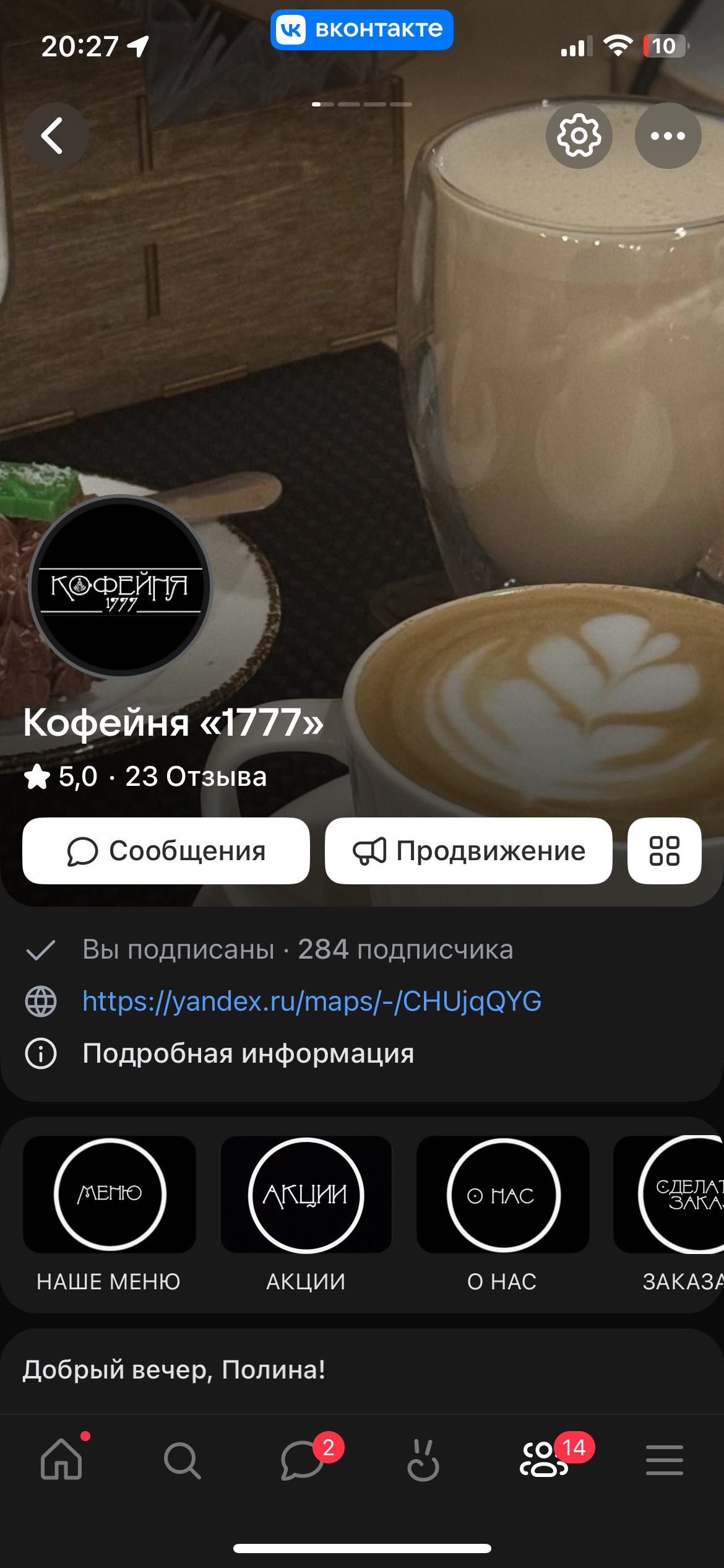 Ведение социальных сетей кофейни в городе Рыбинск. Цель- повышение лояльности к бренду и привлечение подписчиков. Была настроена таргетированная реклама с минимальным бюджетом 100₽ в день, обеспечившая прирост подписчиков (20 человек в день)