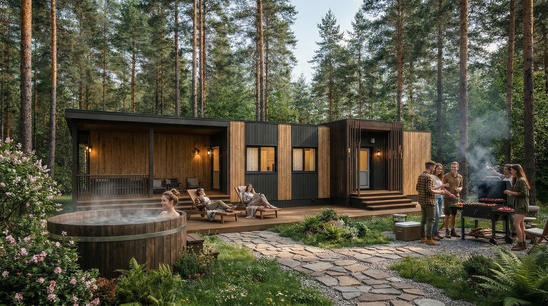 Особенностью проекта является просторная открытая терраса, которая формирует дополнительную зону отдыха на природе. В конструкции пола террасы предусмотрена возможность установки встроенной круглой купели, частично утопленной в настил, что создает атмосферу полноценной спа-зоны прямо на участке.