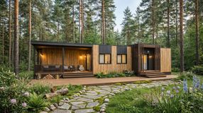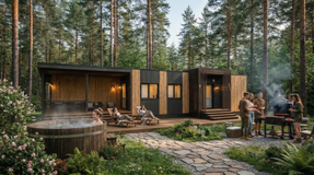 Архитектура дома сочетает лаконичную современную форму, натуральные материалы и продуманную функциональность, создавая уютное пространство для отдыха в природном окружении.