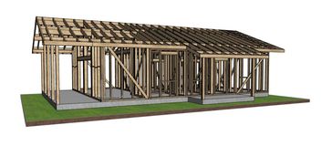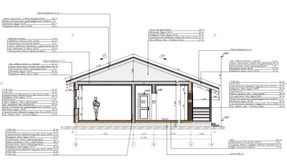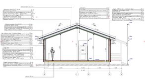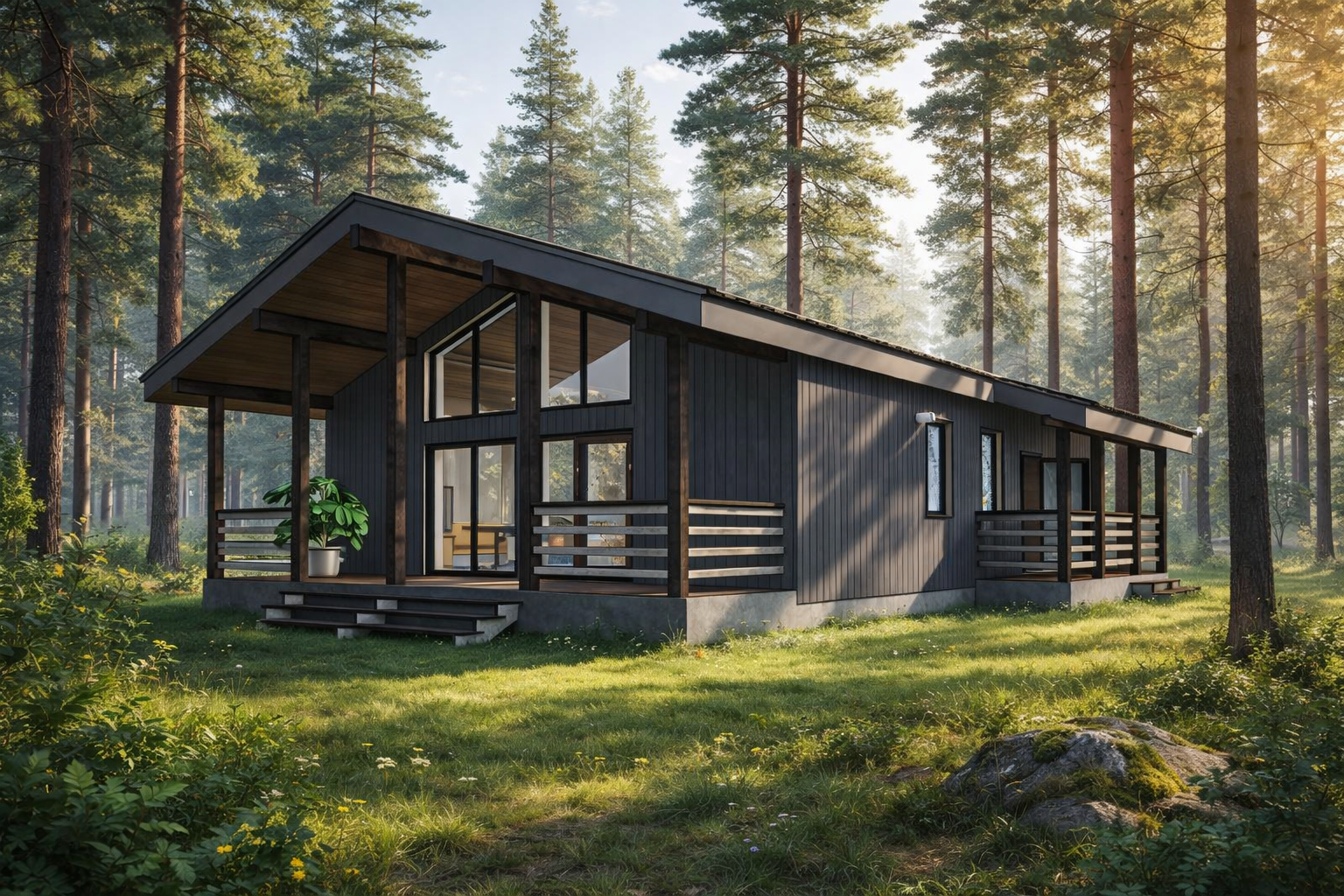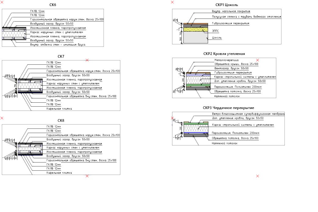 Наружные стены — каркасные, с утеплением и ветрозащитой согласно действующим нормам. Кровля — скатная, с увеличенными свесами, формирующими защищённую террасу и входную группу.
