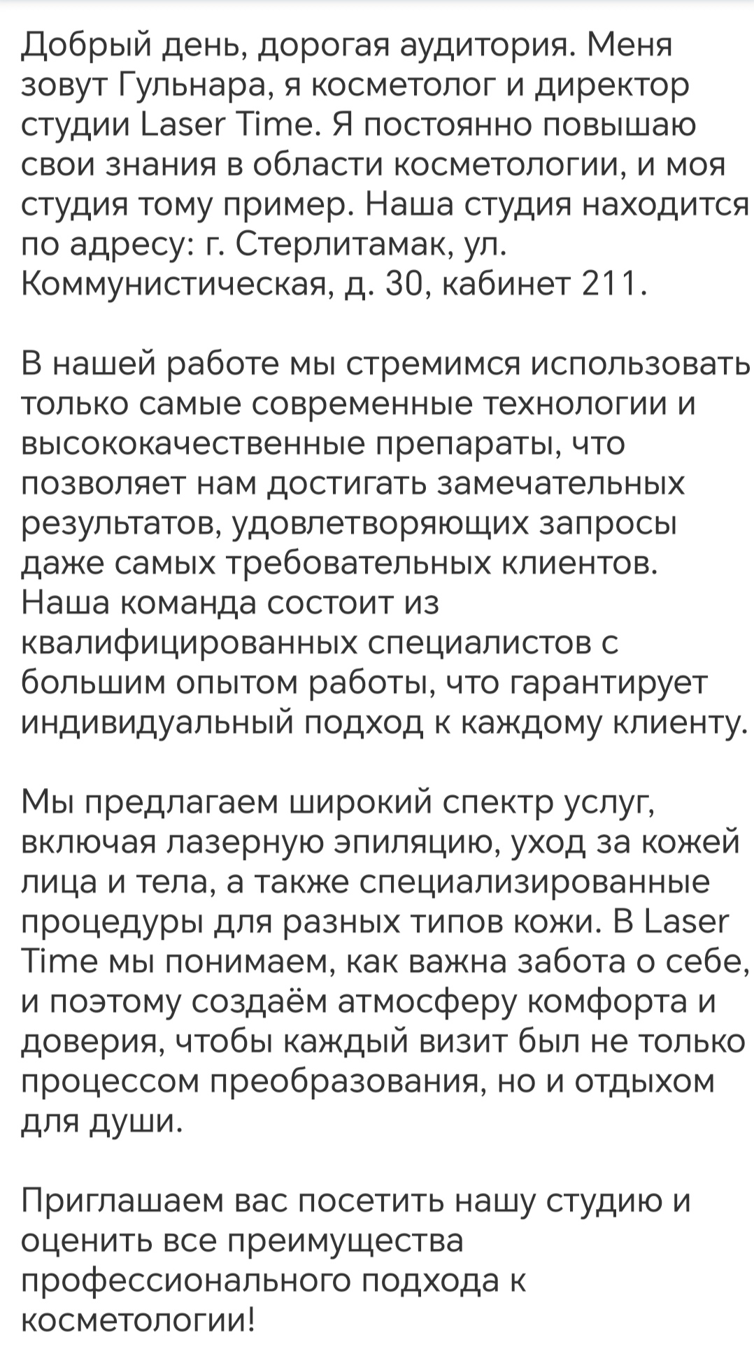 Ко мне обратилась владелица студии лазерной эпиляции.Запрос : нужно представить меня аудитории как специалиста и нового директора.