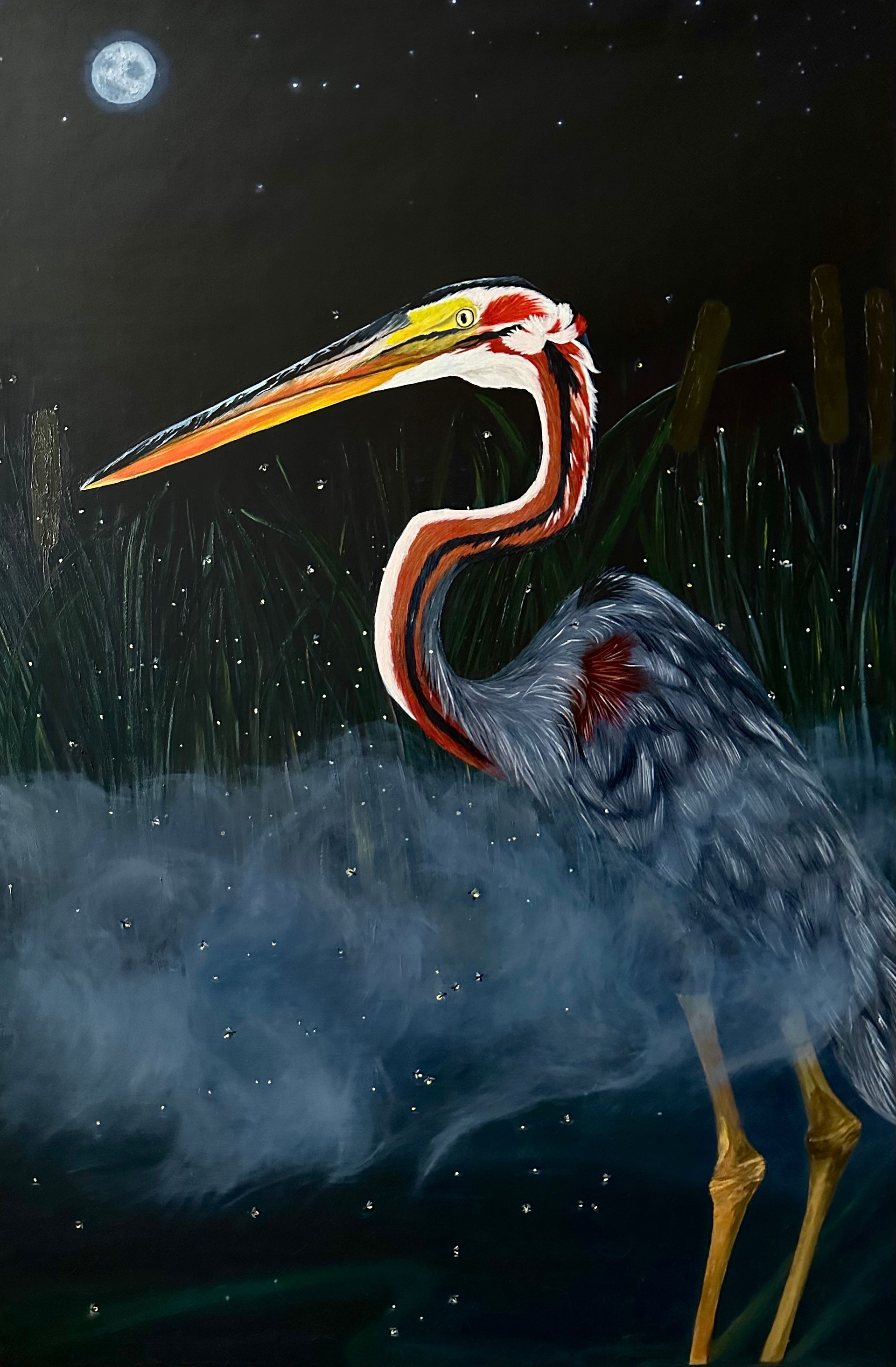 In the twilight of the moon, on the border of water and sky, the Red Heron appears. Its silhouette, woven from fine lines and deep shades, seems to emerge from a misty haze. In this night silence, transformed by the moonlight, it is a symbol of calm and contemplation. The painting invites the viewer to immerse themselves in a world of mystery, where nature reveals its changing beauty, and the night becomes a time of wonderful transformations.#TamaraAndreevna_art#naiv#oli#bird#moon