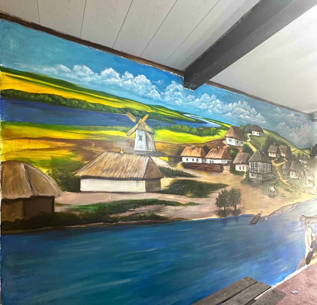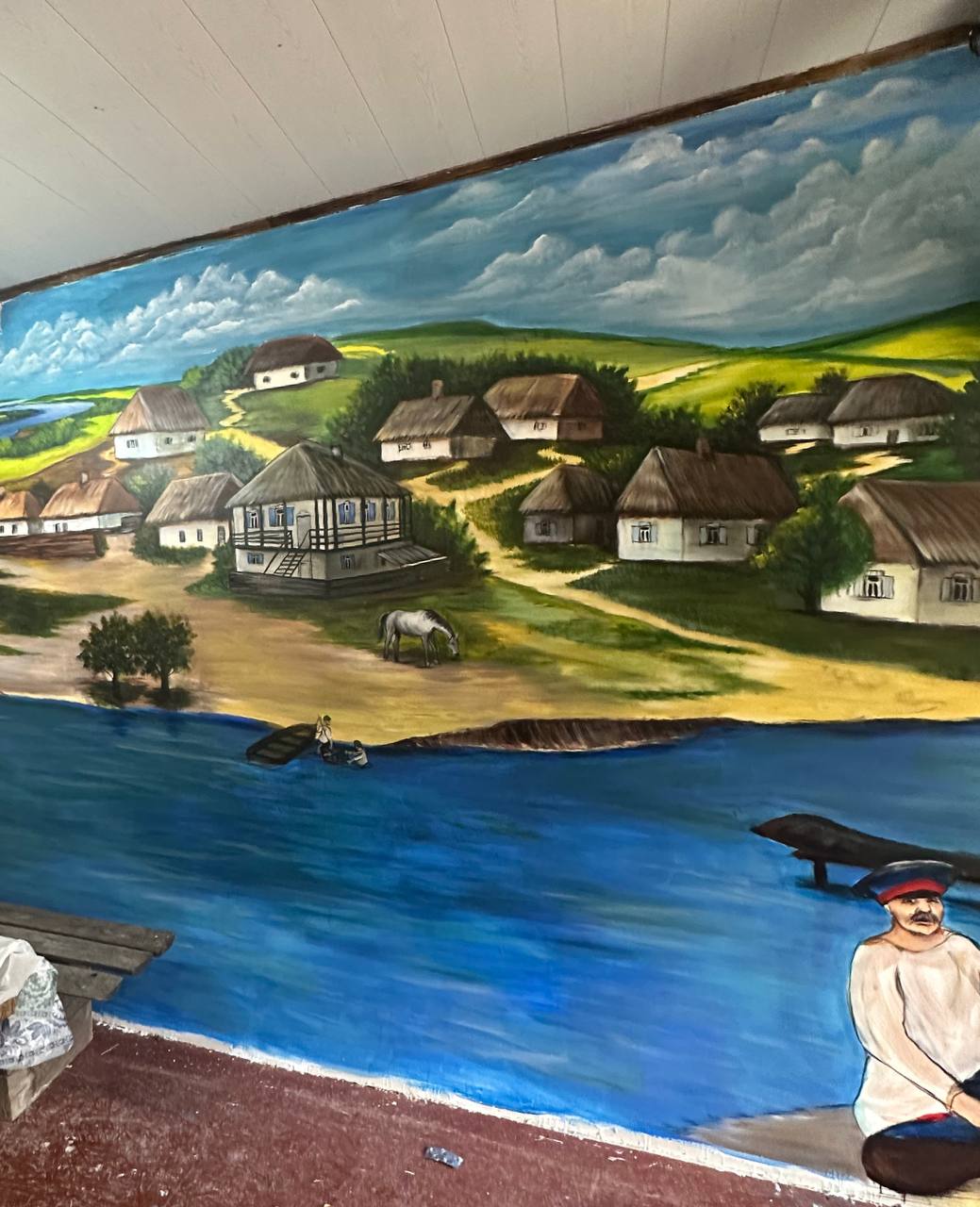 Роспись выполнена на стену размером 2,5 на 8 метров