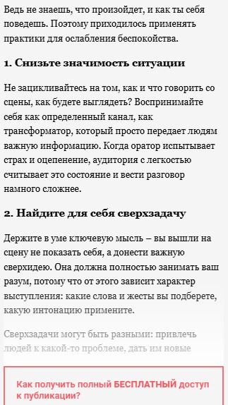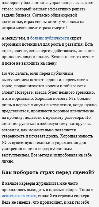 Реализация: сбор фактуры и написание материала : https://www.e-xecutive.ru/career/lichnaya-effektivnost/1996926-kak-preodolet-strah-publichnogo-vystupleniya-7-tehnik