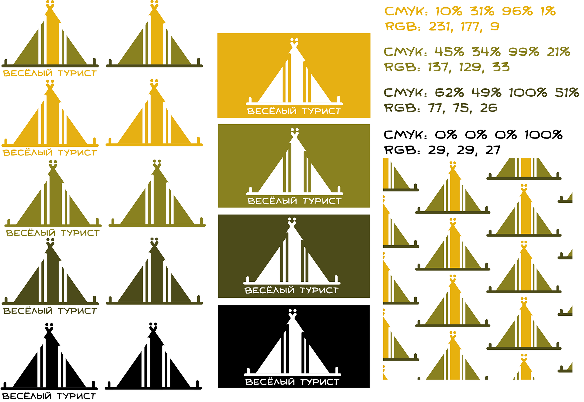 Работы, созданные в рамках курса "Графический дизайнер (Photoshop, Illustrator, InDesign). Включают разработку логотипа (Веселый турист), листовки, плакатов.