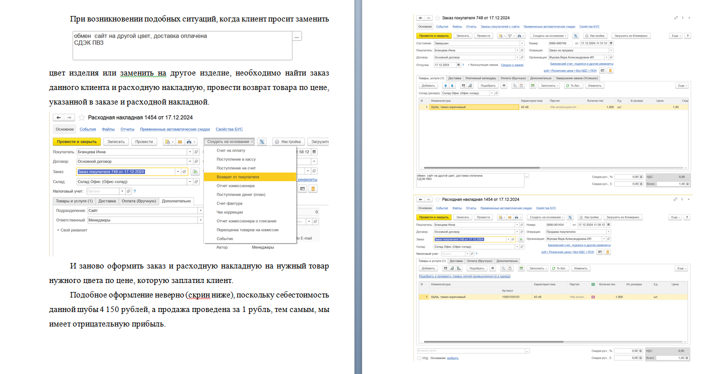 Инструкция по оформлению документов продажи в программе 1С:УНФ в случае, когда клиент просит заменить ранее купленный товар на другойОписана схема действий