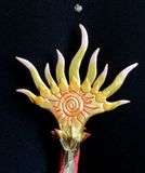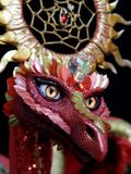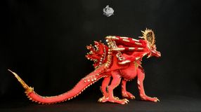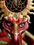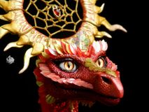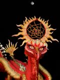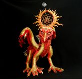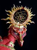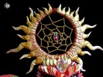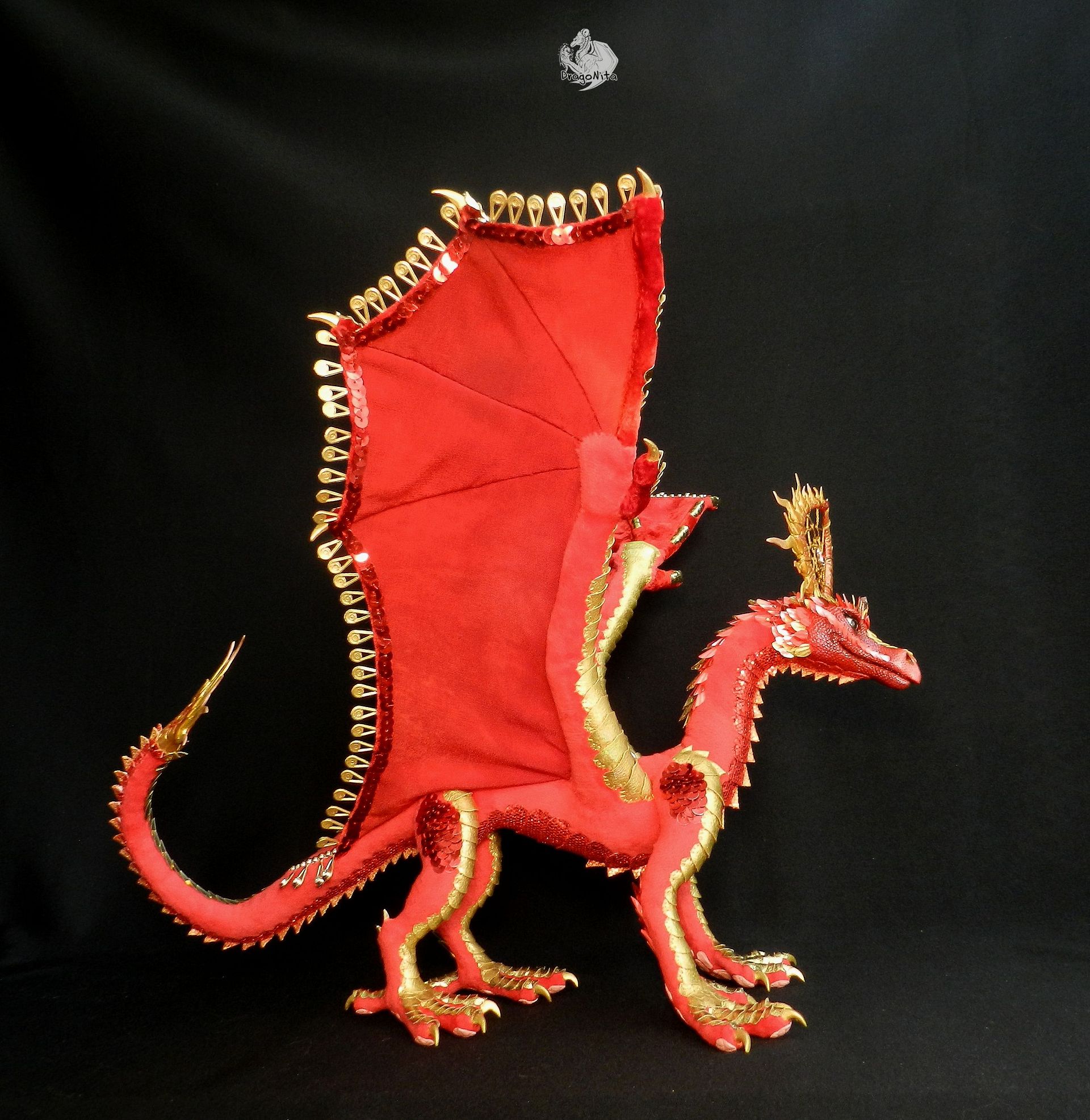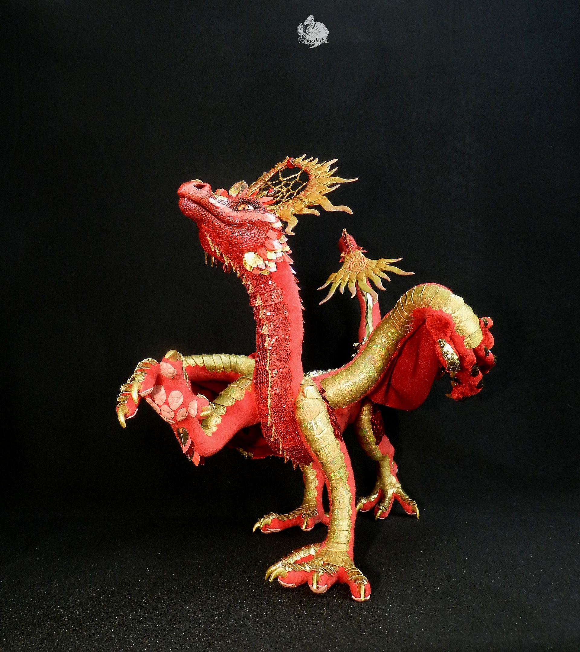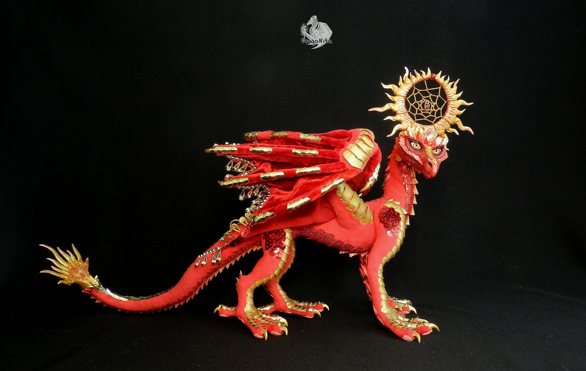 Тело плюш, крылья — винтажный бархат. Лапы на ниточном креплении, крутятся на 360°. На голове и в посохе кристаллы Сваровски. Крылья расшиты пайетками и тесьмой со стразами. Горло, грудь и живот, низ хвоста, плечи и бёдра обшиты эко кожей. Спина и локти расшиты пайетками. Есть крепления для цепочки. Дракона можно расположить в летящей позе. Сола может стоять на 2 лапах с упором на хвост. Крылья складываются, пальцы и лапы гибкие, как и всë её тело. Прекрасно подходит для кукол любого формата.